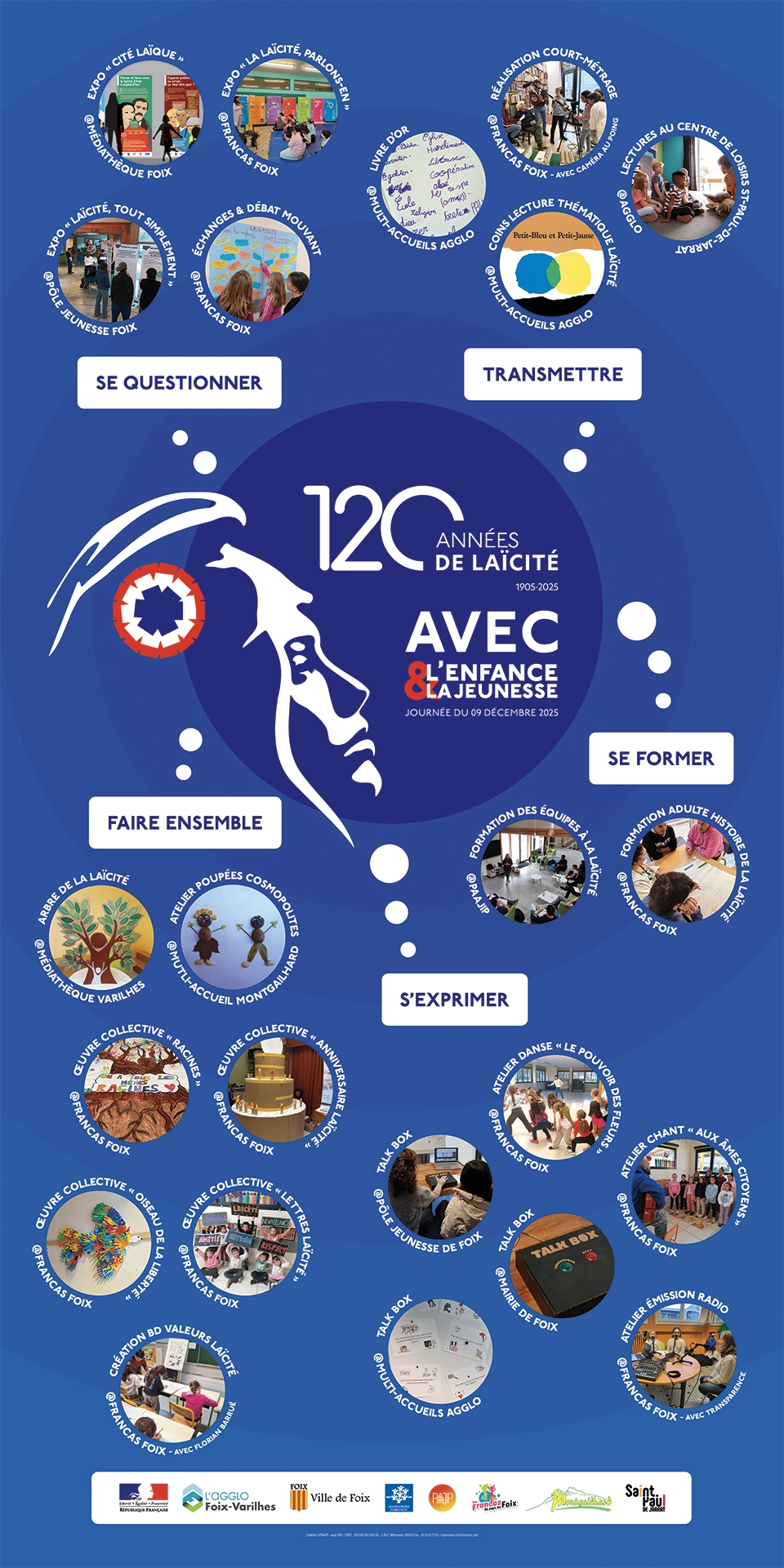 Point d’orgue de cette 120ème année : la journée du 9 décembre à la Mairie de Foix, marquant l’anniversaire de la loi de 1905. Entre prises de parole, temps festifs, créations des enfants et gâteau d’anniversaire aux 120 bougies, cette journée a rassemblé élus, partenaires, jeunes et familles autour de valeurs fortes : liberté, égalité, respect et vivre ensemble.