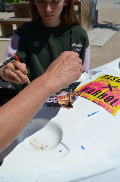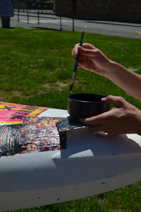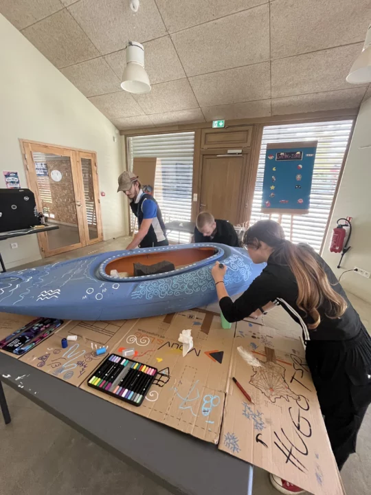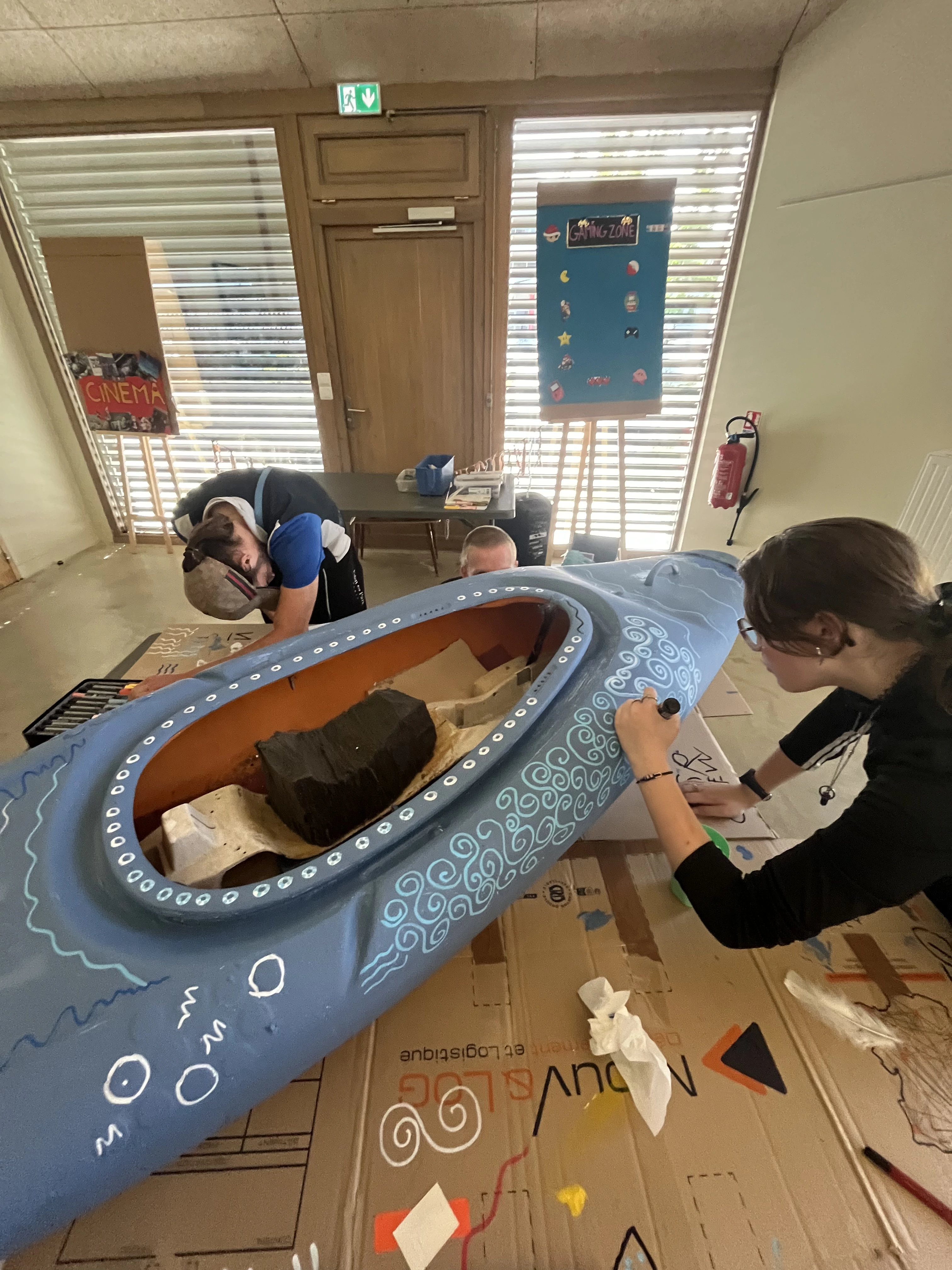 Le premier kayak a été mis à disposition des jeunes à l’accueil du Pôle Jeunesse. Ensemble, ils l’ont décoré à partir de collages d’images découpées dans des livres et des magazines, en lien avec l’univers du sport. Résultat : une composition visuelle dynamique, colorée et inspirée, qui met en lumière l’énergie et la diversité des disciplines sportives. Les jeunes se sont investis avec passion et créativité, fiers de contribuer à leur manière à un événement d’envergure internationale.