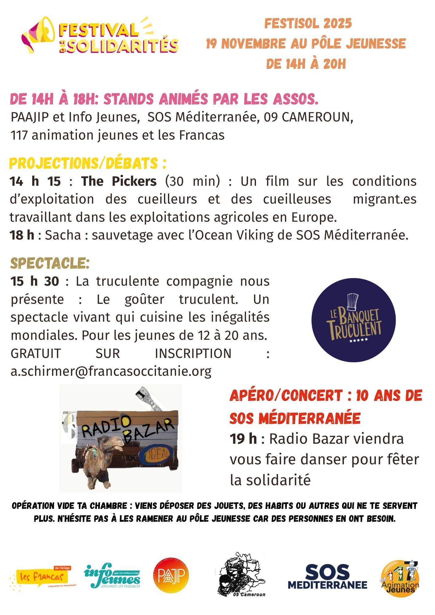 Le collectif Festisol 09 vous invite au grand rendez-vous du Festival des Solidarités (Festisol) le mercredi 27 novembre 2024, dès 14h, au Pôle Jeunesse Collaboratif (PJC) !