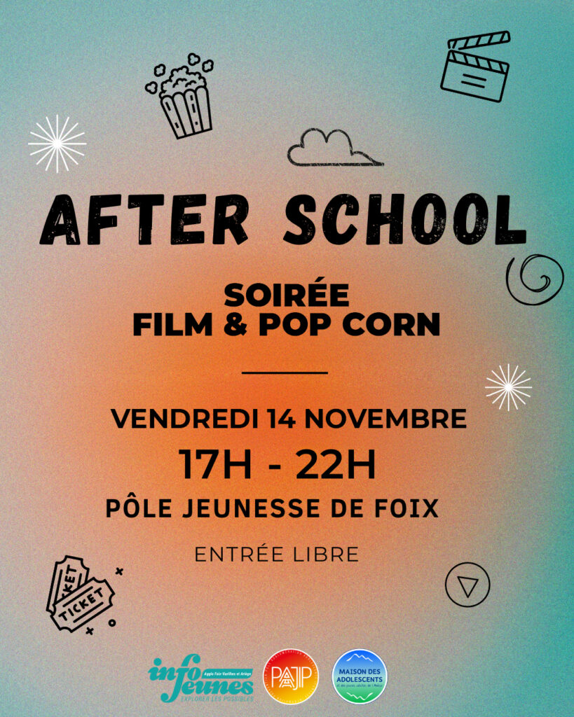 Vendredi 14 novembre, le PAAJIP, la MDA (maison des adolescents) et l’IJ (infos jeunes 09) organisent une soirée After School au Pôle jeunesse de Foix.