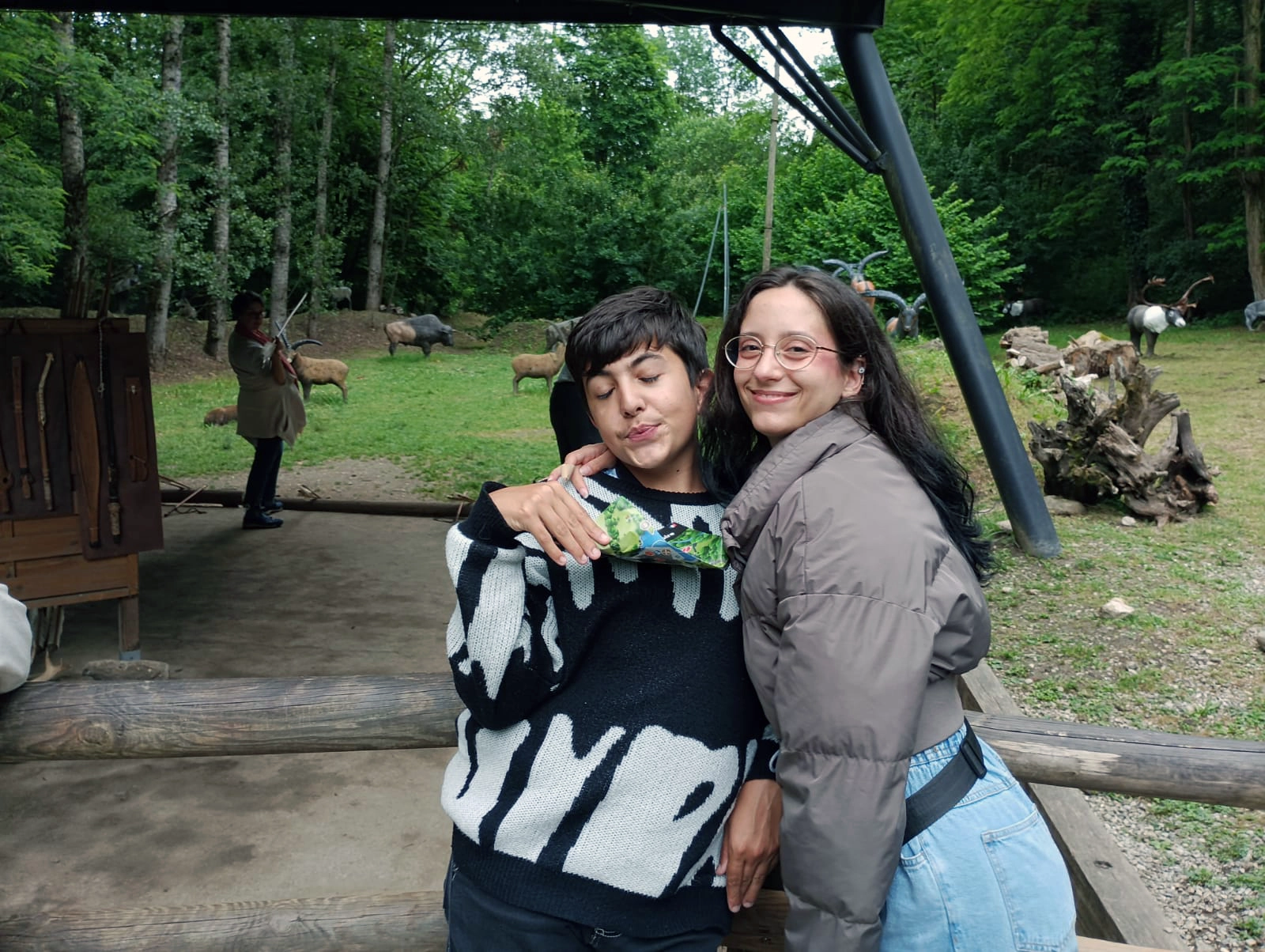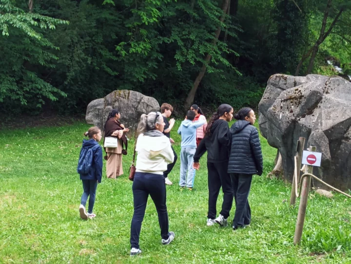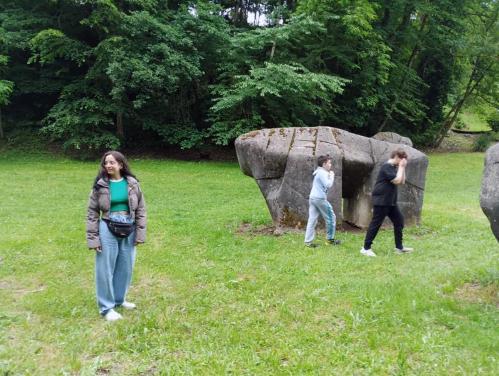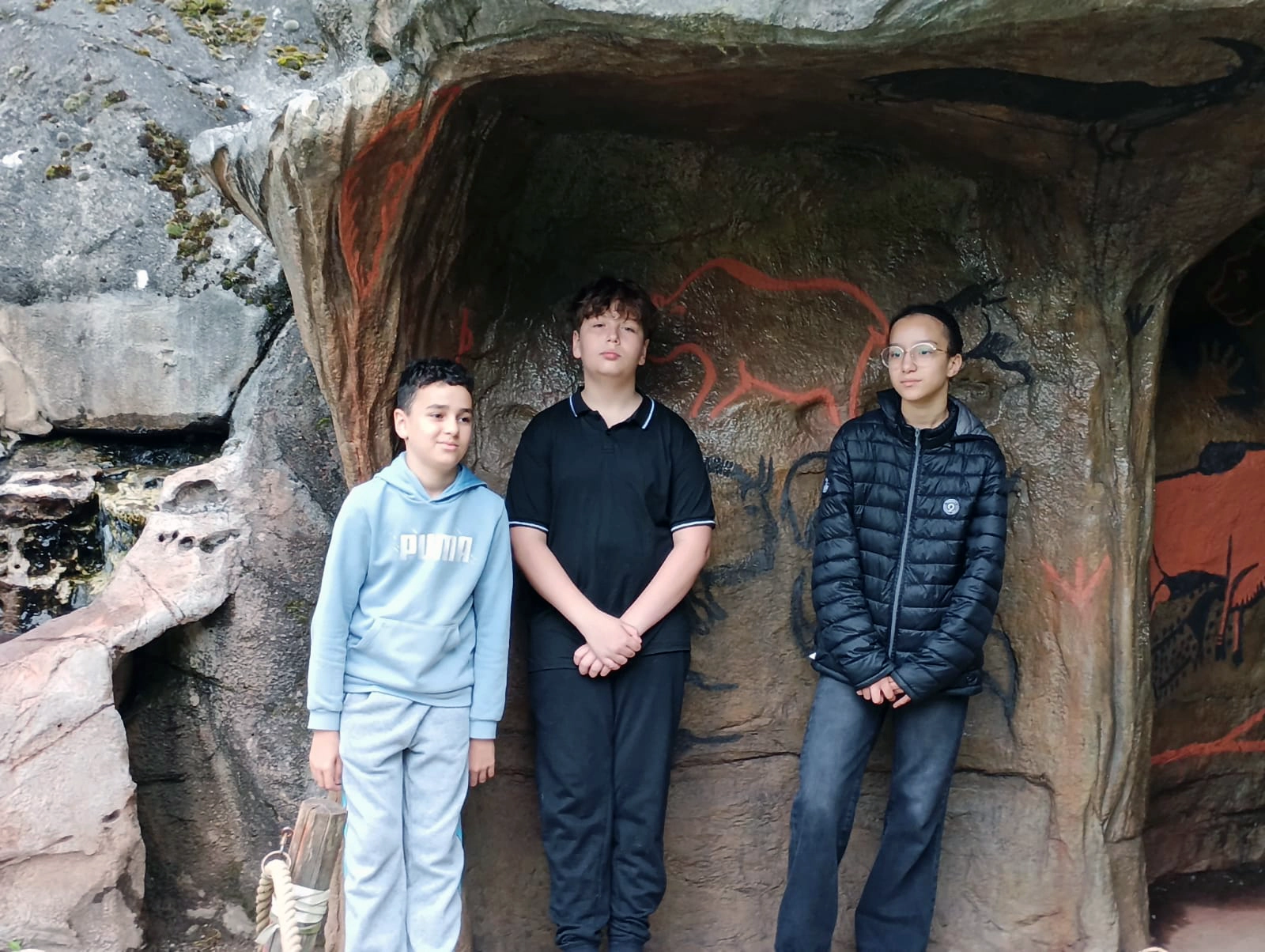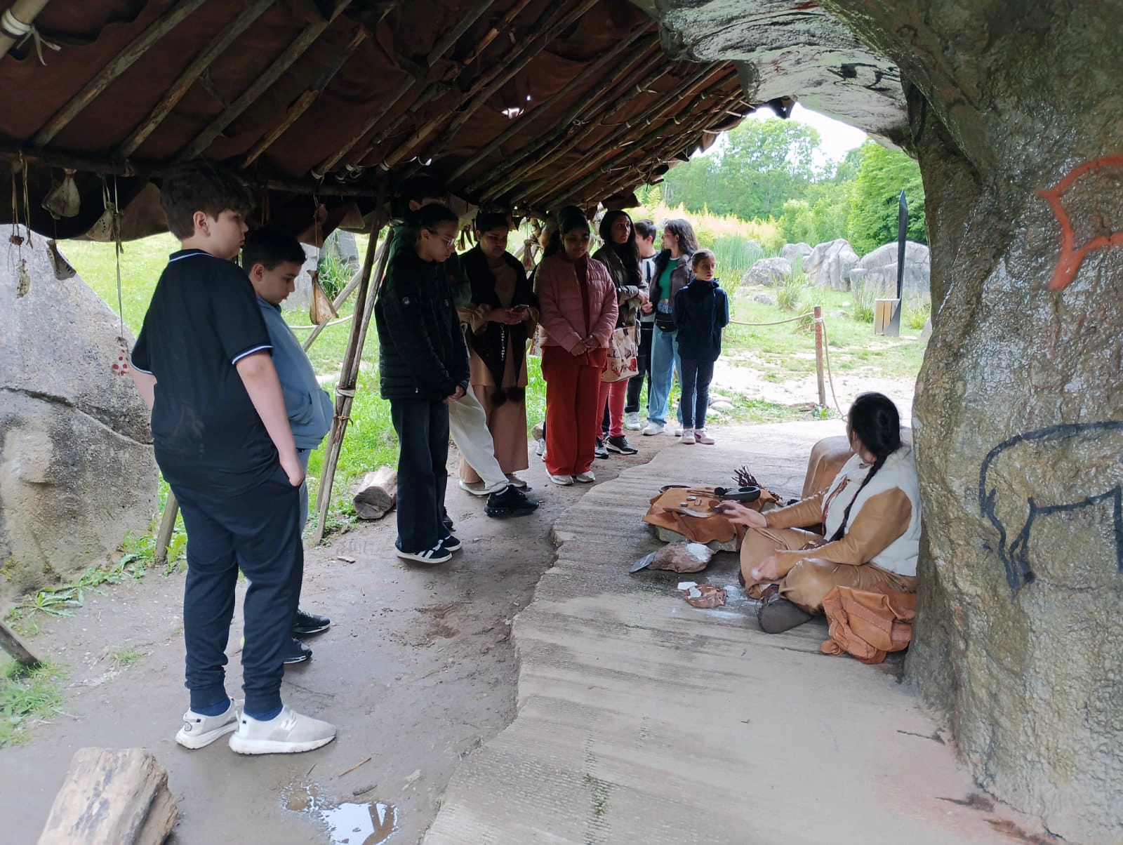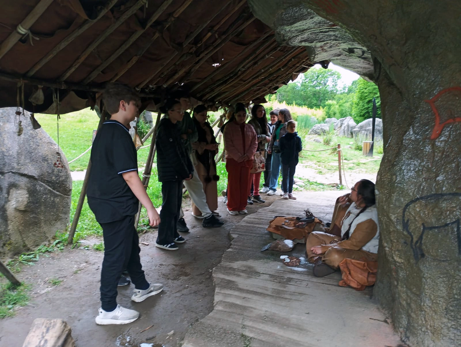 Dès l’arrivée, le décor est planté : des reconstitutions réalistes, des animaux préhistoriques grandeur nature, un site entouré de forêt… de quoi nourrir la curiosité du groupe. L’ambiance est détendue, les jeunes sont à l’écoute et l’équipe aussi. C’est parti pour une exploration des grandes étapes de l’évolution humaine, version ludique et accessible à tous.